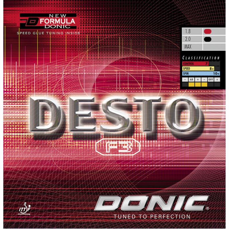 Une sensation de jeu particulaire: DESTO F3 Le DESTO F3 de DONIC possède la sensation de jeu si particulière de la FORMULA DONIC et ce, dans sa forme la plus pure. Il est un peu plus rapide qu'un revêtement élastique classique.